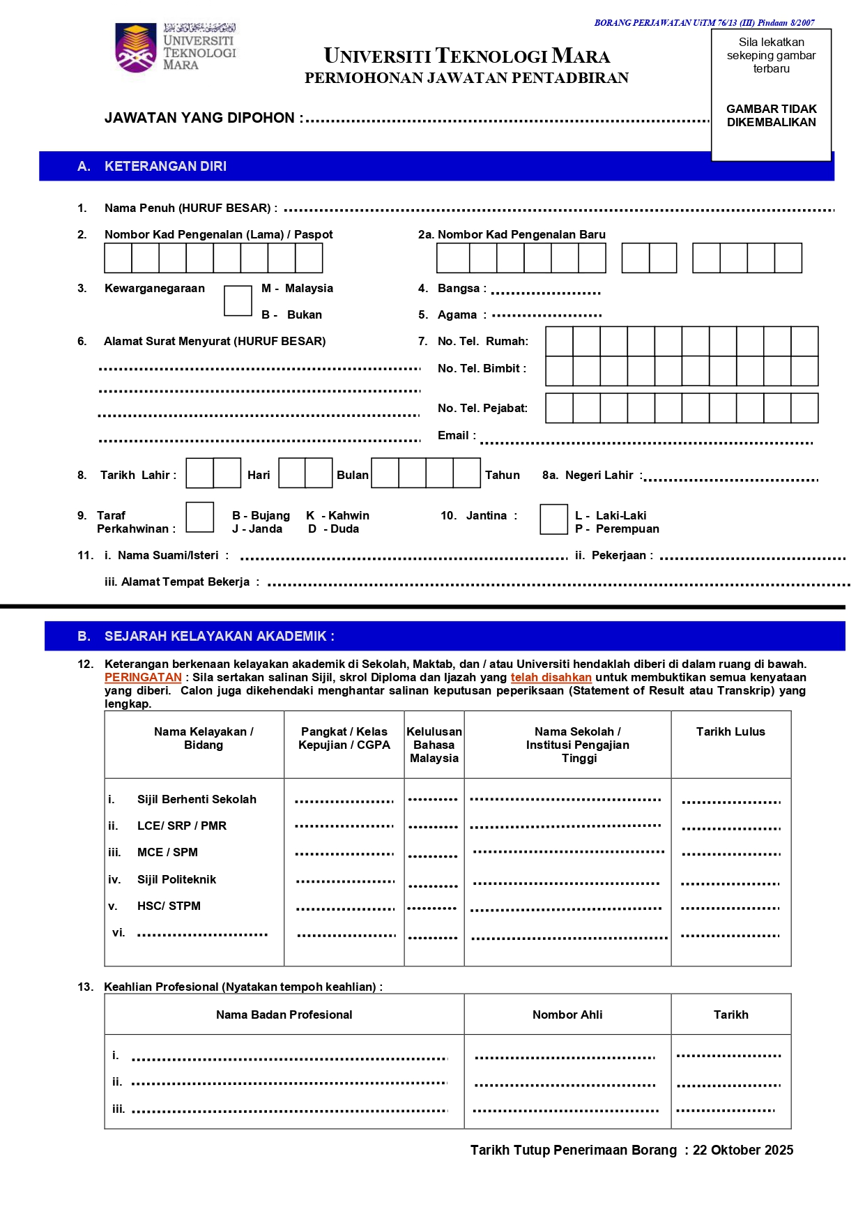 (a) Permohonan hendaklah dibuat di dalam Borang Perjawatan UiTM yang boleh dimuat turun pada pautan yang diberikan di bawah.